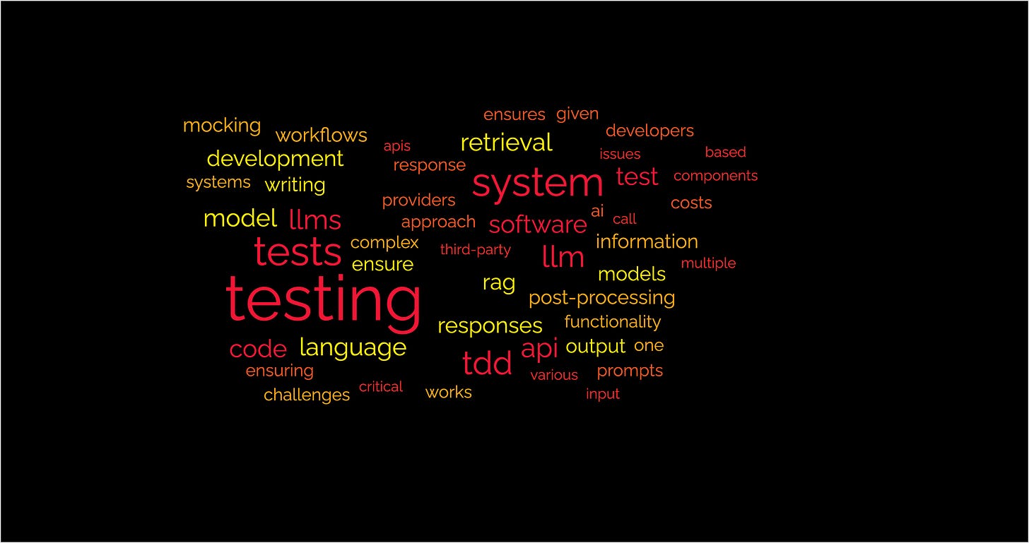 To overcome these challenges, TDD can be a valuable tool for developing software with LLMs. By first writing basic tests based on LLM API calls, or output structure, or atomic components of complicated workflows, developers can ensure that their code is robust and reliable.